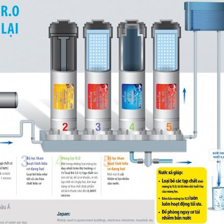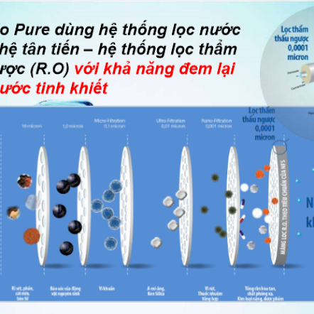 Màng R.O (Loại duy nhất của màng trong thị trường mà loại bỏ bất kỳ chất gây ô nhiễm còn lại, bao gồm vi khuẩn và virus, chất gây ô nhiễm vô cơ độc hại, kim loại nặng và dược phẩm nhỏ hơn 0.0001 micron).